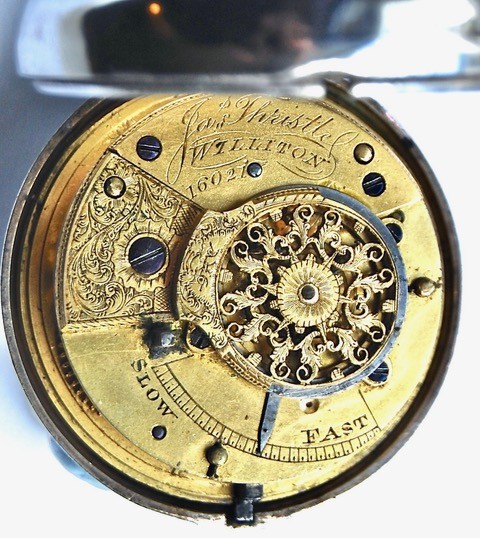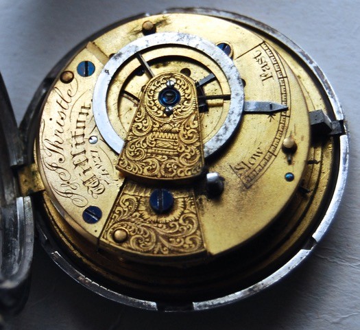Below are several movements of pocket watches marketed by James’s Thristle during the 19th Century all are in silver cases & have enamelled white dials. grey/blue watch paper is also shown.